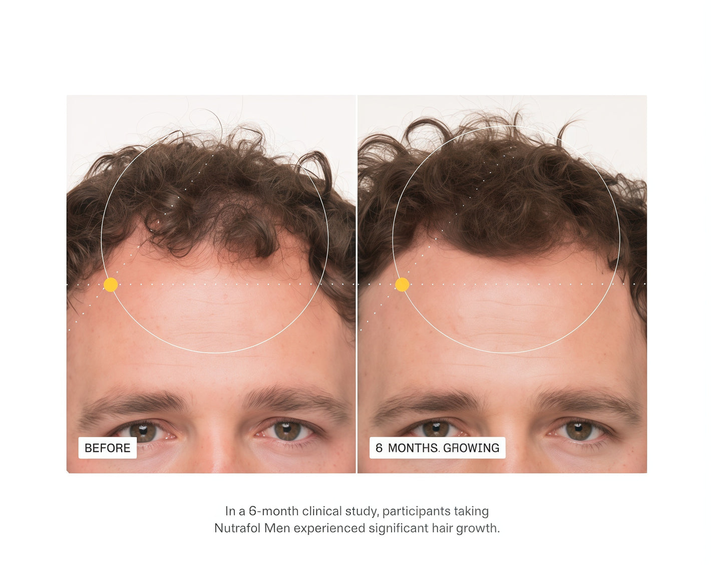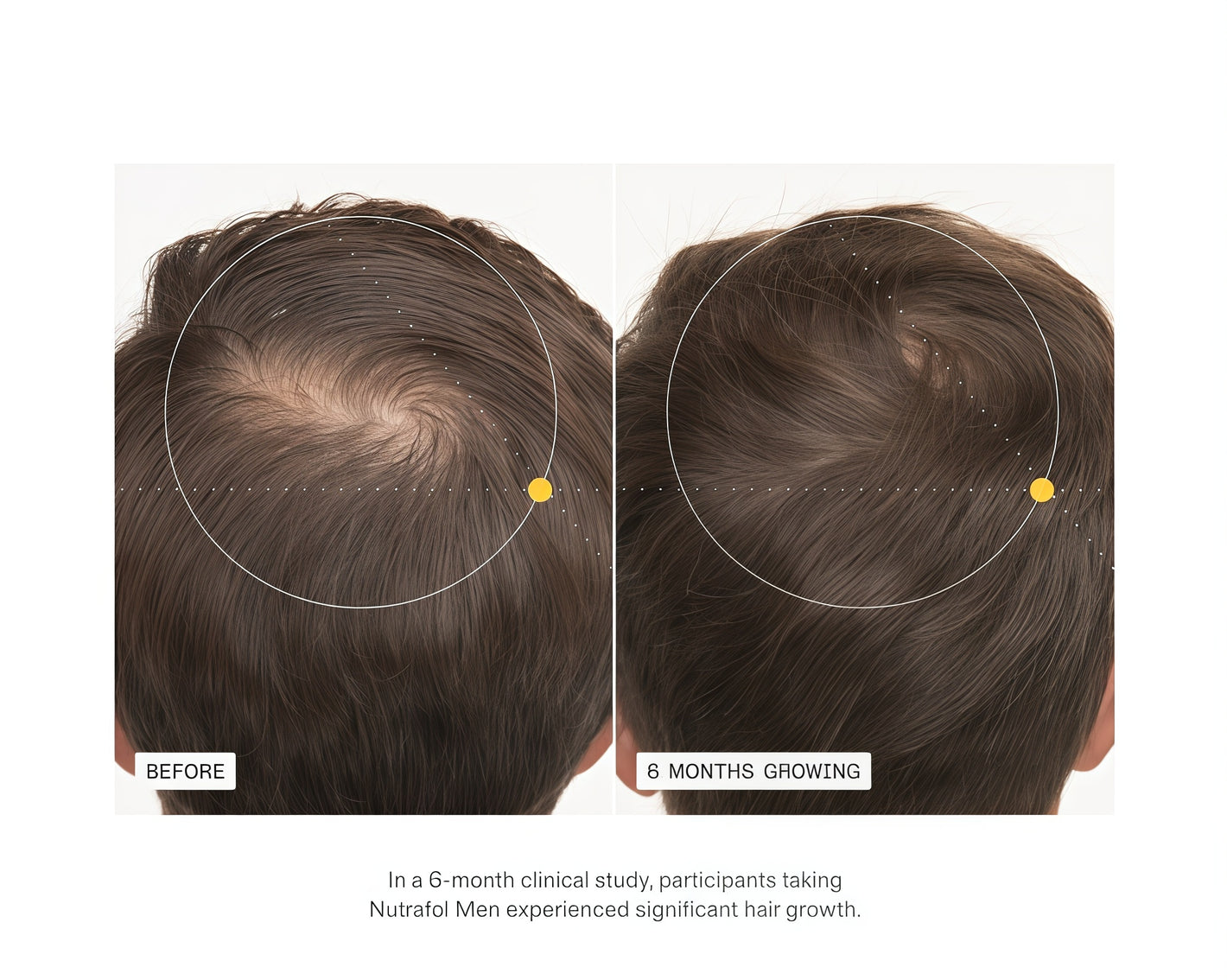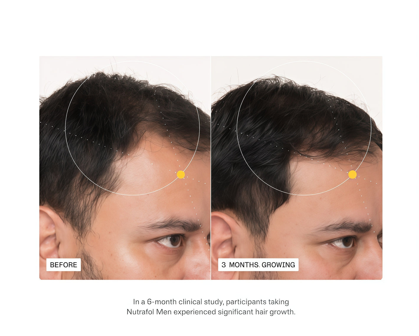 The growth cycle consists of 4 distinct stages. Hair growth only occurs during the firstof these stages. Nutrafol targets 6 root causes of hair thinning to ensure that eachfollicle spends optimal time in this growth stage. lt takes about 3-6 months for improvedhair growth to occur and for hair to grow long enough for changes to be visible. In ourclinical study,women showed visible changes within 3-6 months.